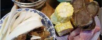 1陳鴨腎及豬肉切塊洗凈汆水(鴨腎切開,更容易出味)。粟米洗凈切件。海竹頭、太子參、百合、麥冬、淮山洗凈後浸15分鐘,雪梨幹洗凈略浸約5分鐘備用。陳皮浸軟備用。