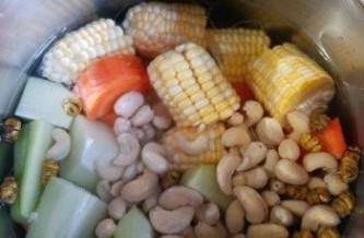 1石斛、麥冬、南北杏和淮山洗凈浸水約15分鐘備用。腰果汆水備用。紅蘿卜和佛手瓜去皮切件。粟米切件。