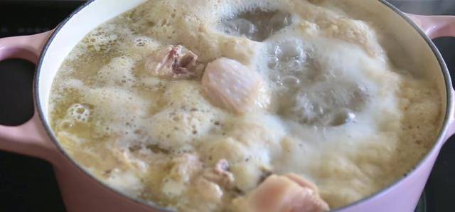 2.炒鍋內加入適量的冷水,然後再把準備好的雞肉加進來,然後在裡面加入蔥薑、白酒去腥,不用蓋蓋子大火燒開。水燒開後撇去裡面的浮沫撈出備用。