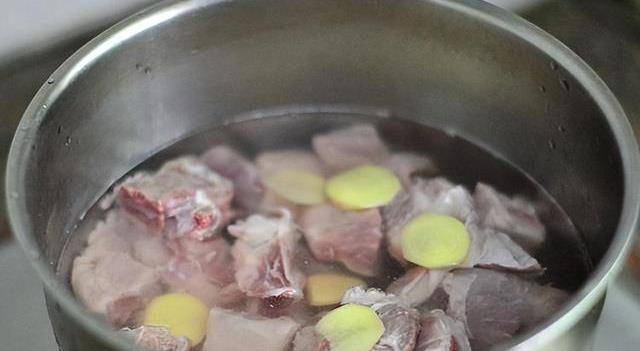 2.炒鍋內加入適量的冷水,然後把準備好的排骨加進來。放入少許的啤酒、蔥薑去腥,不用蓋蓋子大火燒開。水燒開後撇去裡面的浮沫,轉中火繼續煮沸五分鐘後撈出備用。