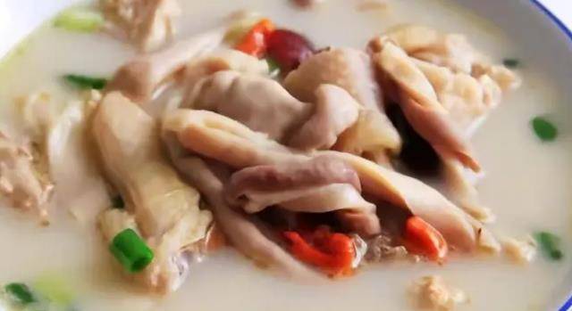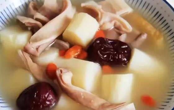 3.豬肚切成小條,雞肉斬小塊,一起放入剛剛燉雞的湯裡,再加入兩根黨參和四顆紅棗,再燉煮1個小時,然後撒入一把枸杞子,加入一小勺食鹽調味,即可出鍋。