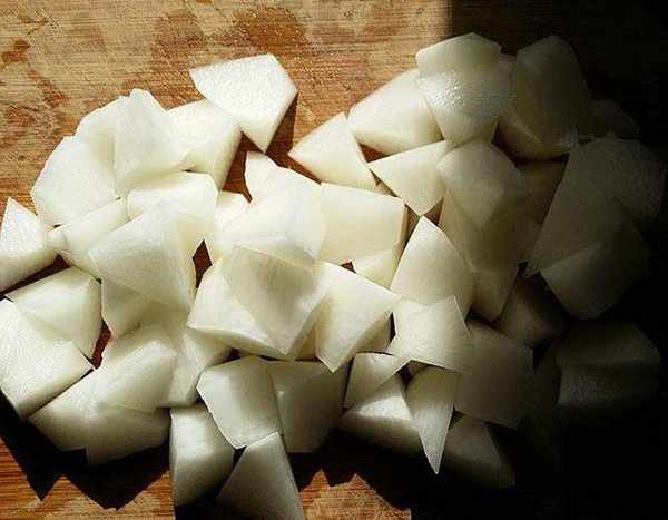 4、趁燉湯的時候、來處理白蘿卜:去皮冼凈後、用刀切成滾刀塊