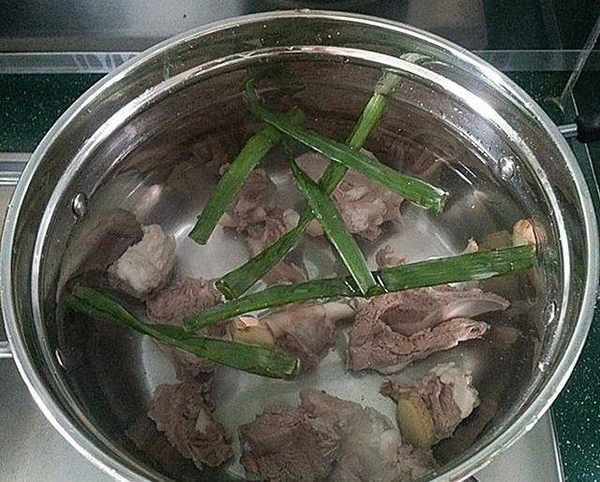 2、稍後將清凈的羊骨放到一個深湯鍋中、放蔥薑和適量清水加蓋大火