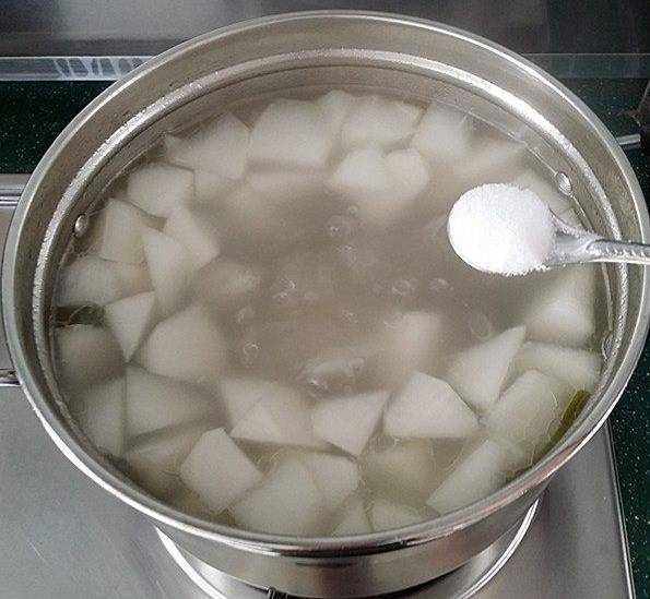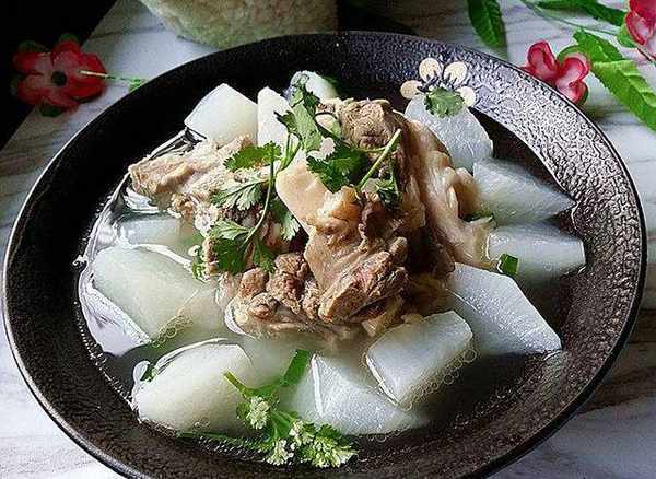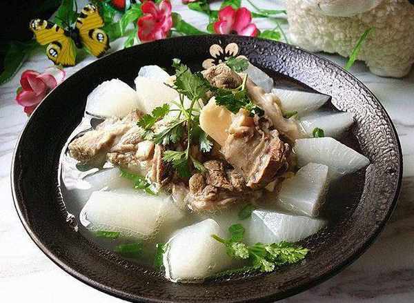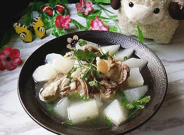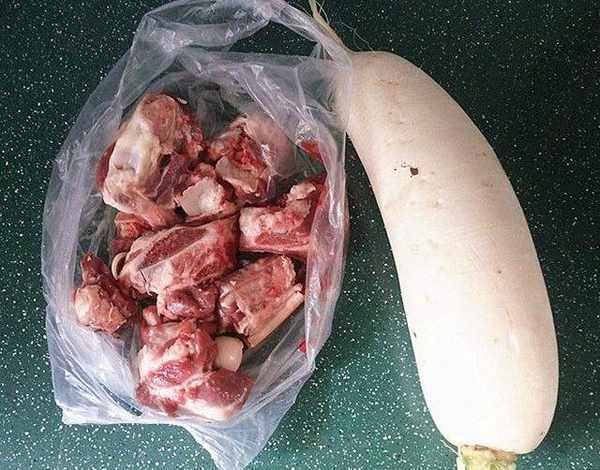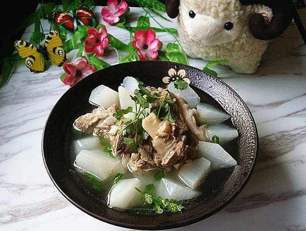 材料:羊骨250克、白蘿卜320克、食鹽3小勺、味精少許、蔥薑料酒適量