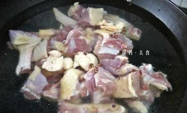 炒鍋燒水,鴨肉冷水入鍋,加入花椒,料酒大火煮開,撇去浮沬後撈出,再沖洗幹凈。