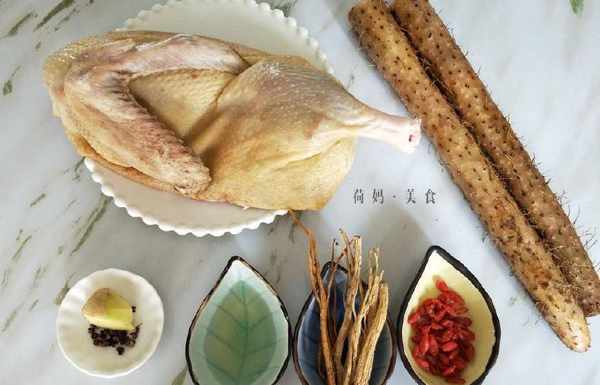 材料:鴨肉半支,山藥2根,薑一塊,花椒幾粒,料酒1勺,當歸3g,黨參5g,枸杞10g,鹽少許
