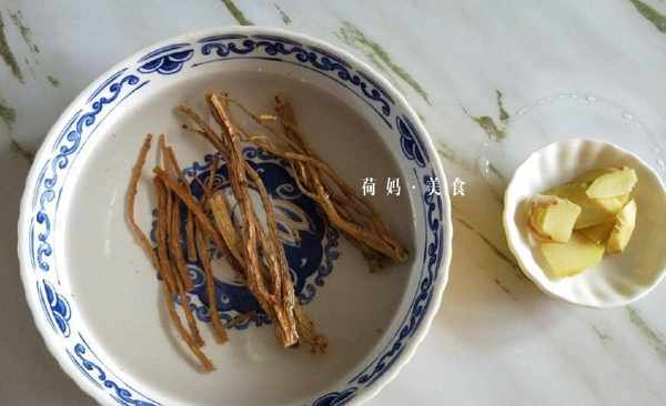 當歸,黨參放溫水沖泡十分鐘撈出。放當歸取其味,讓湯喝起來更香。同時有藥補的功效。做藥膳中藥不宜過多,有點味就好。薑洗凈切片