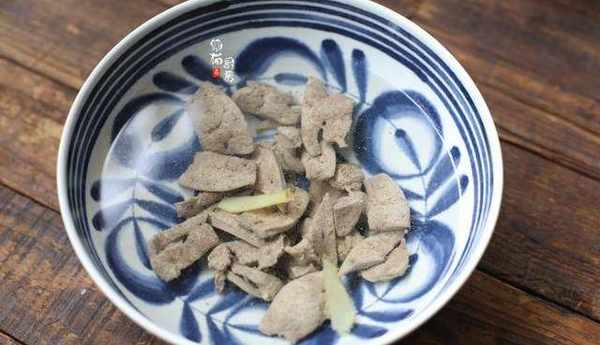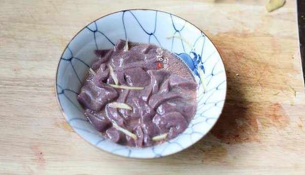 2.泡洗過的豬肝切成薄片,用薑絲和少許淀粉醃制。薑絲能有效去掉豬肝的腥味。