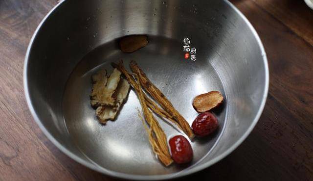 5.把燙好的豬肝片和黨參、紅棗、當歸等全部放入燉盅內,2碗清水,隔水蒸燉1小時左右即可。