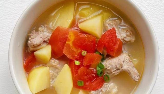 2.加入適量清水,中小火燉煮一個小時左右,再把土豆去皮切小塊放入,番茄也切小塊放入,再燉煮10分鐘左右,加食鹽調味即可出鍋。