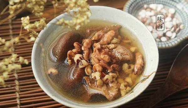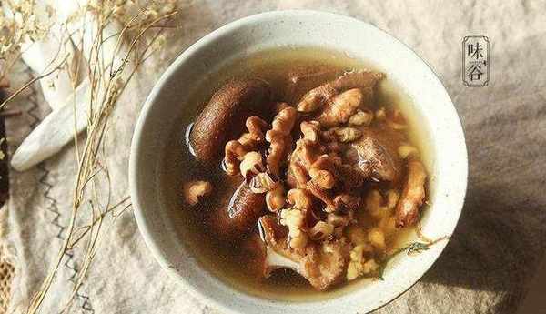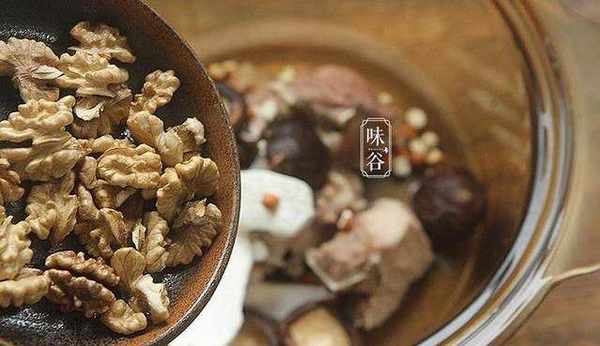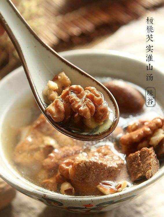這湯的主要材料有淮山藥(幹的山藥)、核桃、芡實、冬菇以及豬扇骨。核桃在我國很早就被稱為“長壽果”和“益智果”,它含有豐富的不飽脂肪酸,經常食用核桃,不但不會升高血糖,還能潤腸,對保護心血管,預防冠心病等是頗有裨益的。長輩們牙齒不好,用來煲湯喝是最好不過的瞭,搭配起其他材料合而為湯,對一傢大小都有很好的補益養生作用。