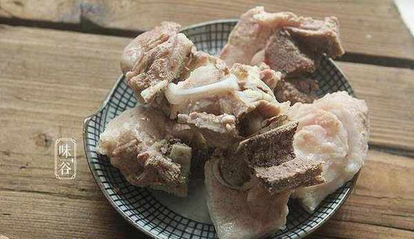 3、把豬扇骨斬塊後,放入清水中煮開1分鐘左右,然後撇去浮沫撈出來待用;