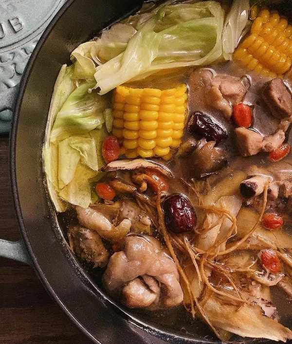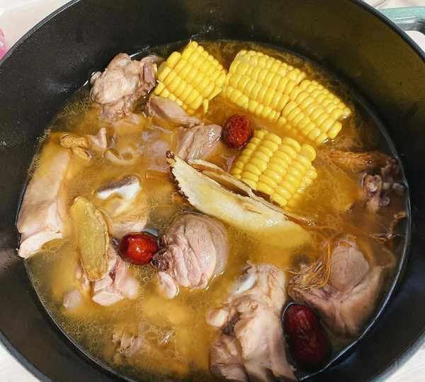 4. 加入藥材、玉米,再上蓋中小火燉煮20分鐘