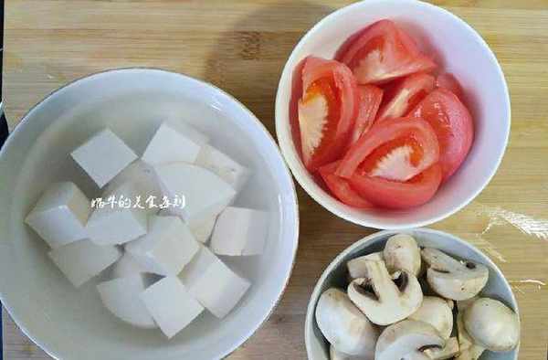 豆腐切小塊用淡鹽水浸泡一會,番茄洗幹凈切小塊,蘑菇切小塊。