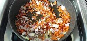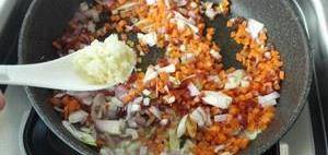 倒入胡蘿卜、香腸、洋蔥翻炒~
