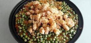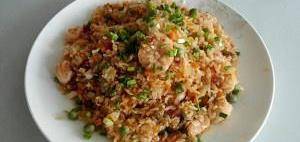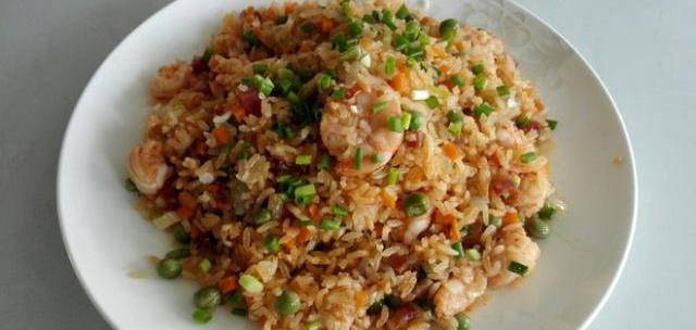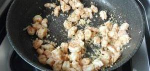 這個時候飯也燜好瞭,將蝦仁倒米飯上~