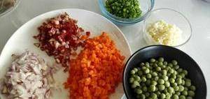 蒜切末,胡蘿卜、洋蔥、香腸切丁,小蔥切末備用,另外切幾片大蔥~