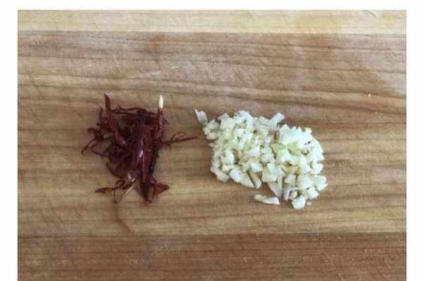 3.將準備好的幹辣椒切成絲,大蒜去皮,用刀剁成末,放置備用。