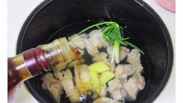 6.我們準備一個煮鍋,在鍋中加入適量的水,把排骨倒入鍋中,將小蔥和生薑片倒入鍋中,再加入少量的黃酒,大約煮十分鐘左右。