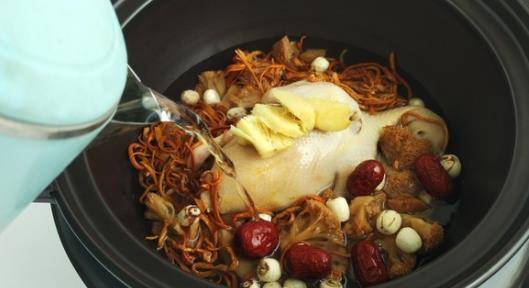 第四步:我們將乳鴿放到砂鍋中放入巴西菇和蟲草花還有蓮子,紅棗,然後我們再將生薑拍碎一起放到砂鍋中。加入適量的純凈水,水要沒過食材。