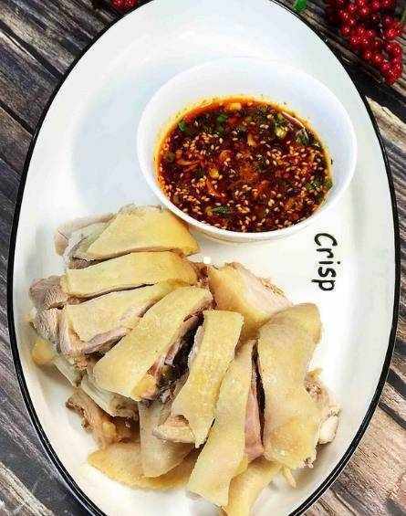 4、靜置的雞肉切成小塊擺在盤子裡,配上蘸料就可以開吃瞭。