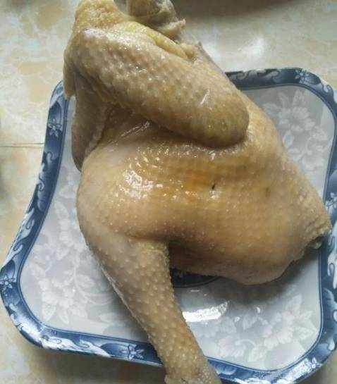 1、選一隻鮮活的三黃雞,如果能買到仔雞就更好,讓雞販幫忙宰殺處理幹凈。處理好的雞洗幹凈後剁掉雞頭和雞屁股。