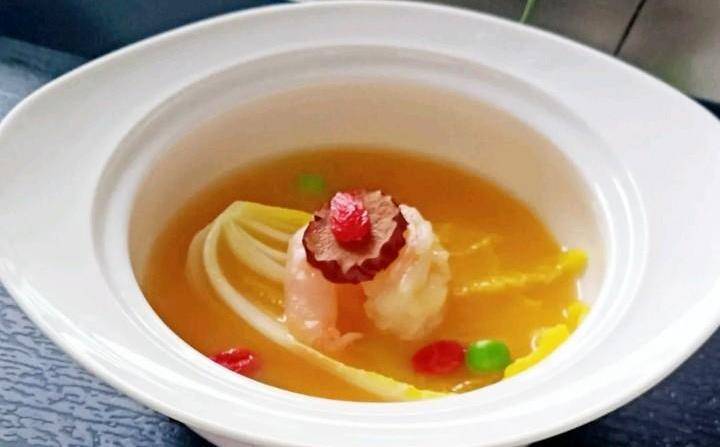 娃娃菜心改刀去筋備用,砂鍋上火入高湯調味,下入娃娃菜、青豆、大棗、枸杞煮入味,下入青蝦微煮起鍋裝盅