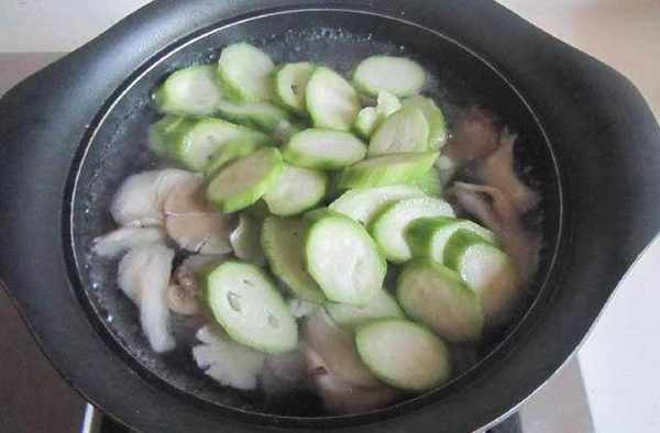 5.倒入準備好的平菇進去煮上一分鐘,再放入絲瓜片進去煮;