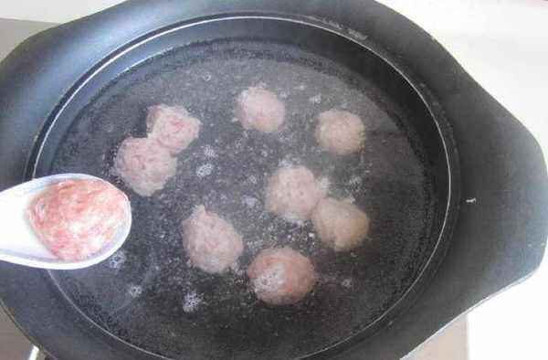 3.用勺將擠好的丸子放入鍋中水中煮,註意不用等到水開後再下鍋,溫水就可以放入丸子瞭;
