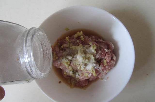 1.在肉餡中加入適量鹽、胡椒粉、薑末和料酒等調味料,攪拌均勻入味,醃制一會;