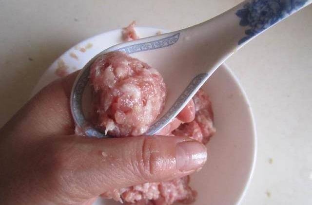 2.用左手團一下肉餡,從虎口處擠出肉丸;