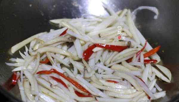 4.熱鍋下油,把蓮藕絲和杏鮑菇絲倒入鍋中,加少許紅辣椒絲增加顏色以外同時也增加少許辣味,讓這道菜的口感風味更佳。