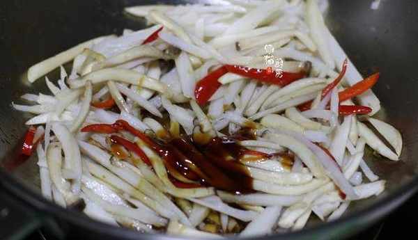 5.炒至杏鮑菇絲微微變軟斷生,加入適量蠔油和生抽,最後撒少許食鹽和1茶匙陳醋調味,大火翻炒拌勻即可出鍋。