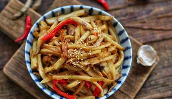 食材:蓮藕1節,杏鮑菇250克,紅辣椒1-2個,陳醋1茶匙,油適量,鹽少許,生抽1茶匙。