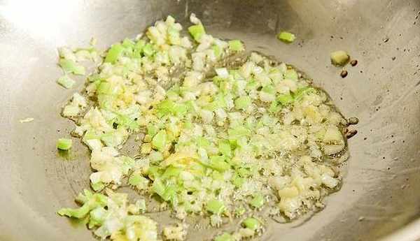 1、提前把香蔥、大蒜、香菜切碎,然後鍋燒熱,倒入蔥末、蒜末炒出香味。