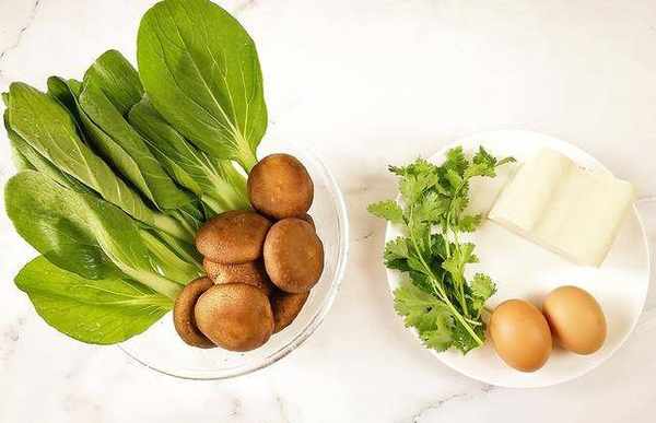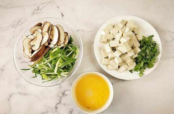 第一步,香菇去老梗洗凈切成片,油菜洗凈切絲,嫩豆腐切成1厘米大小的塊,雞蛋打散備用,香菜切末。