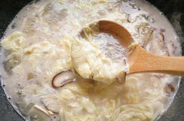 第四步,沿著鍋邊倒入備好的雞蛋,先不要攪拌,等到鍋中再次煮開後雞蛋結成蛋花。