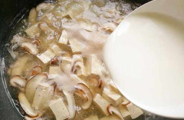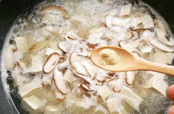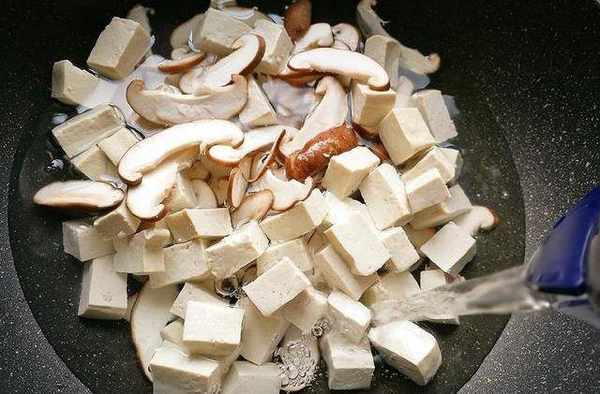 第二步,鍋中放入切好的香菇和嫩豆腐塊,倒入500毫升清水,加入少許鹽,用大火煮開後撇去浮沫繼續煮1分鐘。