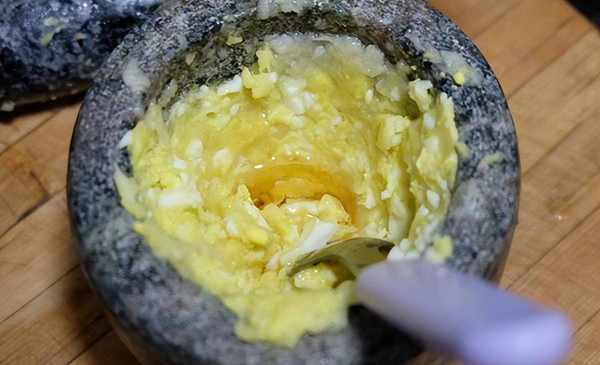雞蛋六個冷水下鍋,開大火燒開後,轉中小火煮上十分鐘,再燜上兩分鐘,接著撈出來,用涼水沖涼,剝去外殼,然後對半切開,把雞蛋黃取出,把雞蛋清一分為二,均勻的擺盤,