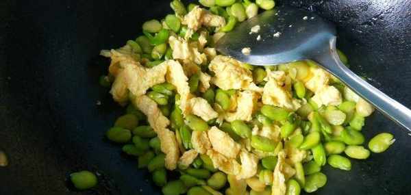 最後再放上鹽,充分的攪拌均勻備,接著把鍋燒熱再放油,防止雞蛋粘鍋,然後把蛋液和蠶豆下鍋,倒進去開中小火炒熟後,就可以盛出來吃瞭,鮮嫩美味,含有高蛋白,別不知道吃。