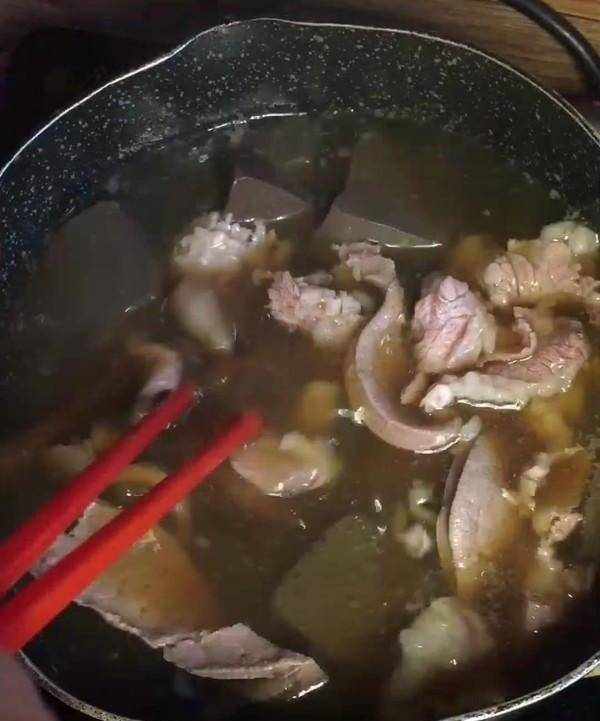 3.放入豬肝,瘦肉等,鍋再次沸騰燒開。按照自己喜歡的加入河蝦海鮮豬內臟等。