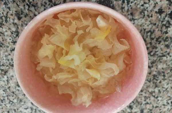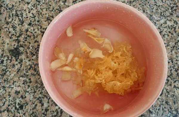 2、拿出一個大小合適的容器,放入清水,把百合跟銀耳放下去一起浸泡半小時左右。如果上班族沒有時間的話,可以選擇在出門的時候就泡上,這樣下班回傢就可以直接煮瞭。