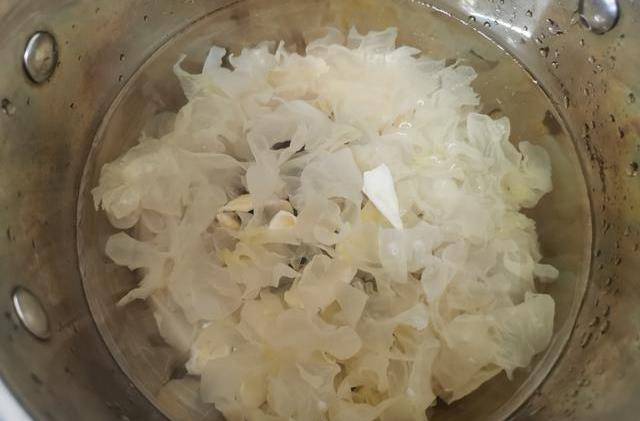 3、泡發好的銀耳會膨脹開,要把銀耳的蒂去除幹凈,然後把銀耳百合濾幹水清洗幹凈,銀耳可以摘小朵備用,以便食用。