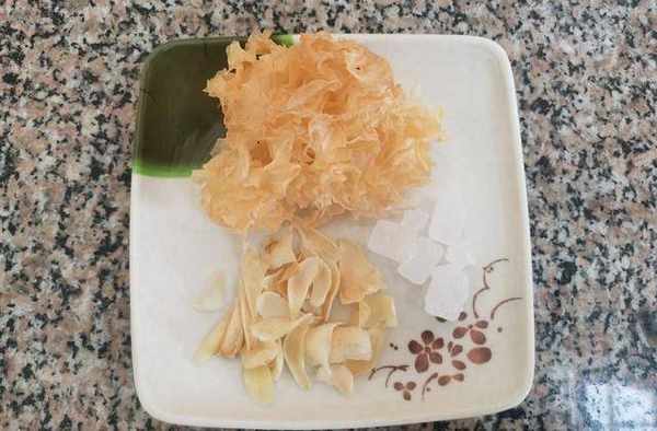1、準備適量的銀耳,百合跟冰糖。銀耳跟冰糖一般在超市就可以輕易地買到,如果超市找不到百合的話,可以選擇去中藥店購買。