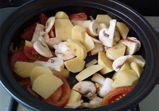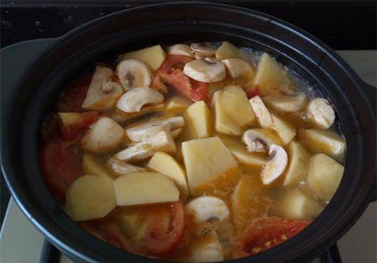 接著我們把已經切好的土豆和蘑菇也放入鍋裡邊去翻炒均勻,讓他們全部都沾染上已經炒出來的番茄汁。