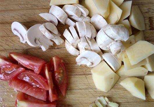 趁著醃制牛肉的時間,我們可以將其他的配菜準備好,將新鮮的土豆清洗幹凈,去皮切成小塊,番茄也洗凈去蒂切小塊,我準備的是白色的,這種蘑菇清洗幹凈之後把它切成薄片,生薑也洗凈,切成合適的生薑條。