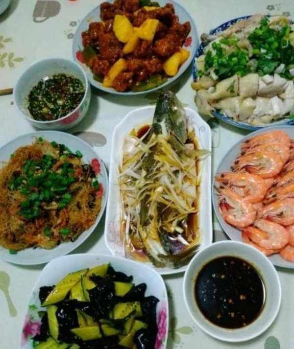 第三位朋友的飯菜也是很豐富,相信很多人都會被誘惑住,清蒸魚,大蝦,白切雞,螞蟻上樹,菠蘿排骨,涼拌木耳,很多人說聽這名字就香,這幾道菜也都是很有名的菜,白切雞是非常有名的粵菜,還在節日中,餐桌上都會有這道菜,鱸魚的價值也非常高。