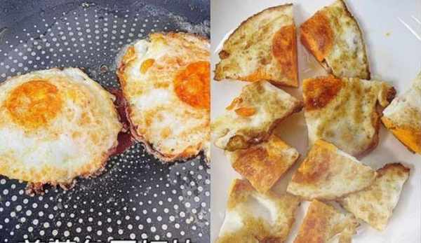 第三步:鍋底調入一些橄欖油,鍋中打入兩個雞蛋,雞蛋要中小火慢慢煎,等待兩面都煎至金黃,盛出放涼,切成若幹小塊。
