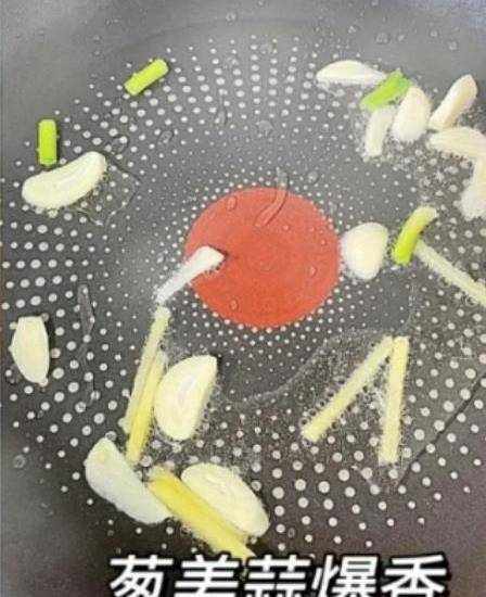 第四步:鍋底調入橄欖油和豬油,加上一些蒜片和薑絲,快速爆炒出香味,倒入裙帶菜快速煸炒一會兒,加上幾大碗開水煮沸。