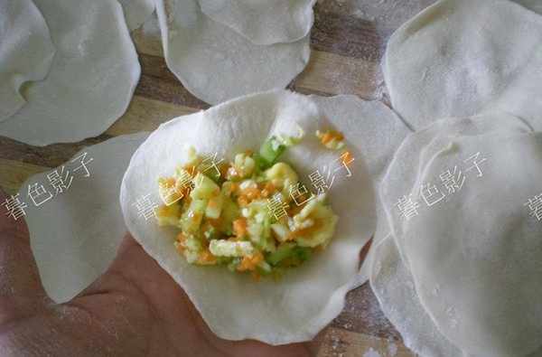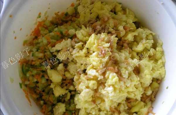 胡蘿卜要把皮削瞭,黃瓜洗凈切碎,雞蛋打散炒成碎一些的小塊。先用油把餡料拌好瞭,這樣可以防止菜出水。切記,先不要加鹽,包的時候再加鹽。拌好的餡料,把炒好的雞蛋,小蝦米都放進來,加鹽混合均勻備用